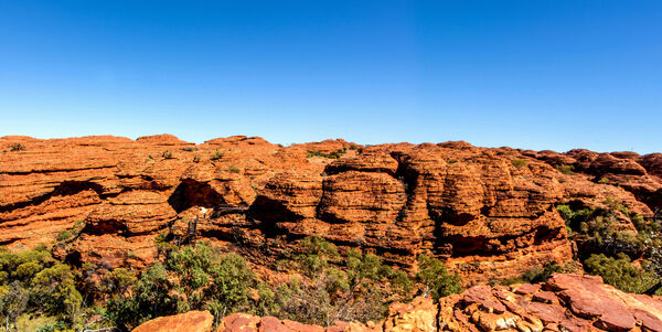 The beauty of Kings Canyon is not just in its grandeur but also in its details. The rich red of the sandstone, the vibrant green of the vegetation clinging to the rock faces, and the clear blue of the Australian sky create a stunning contrast that's a feast for the eyes.